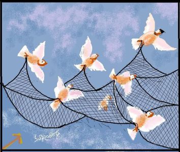 నేను వేసిన బొమ్మ మిత్రలాభంలో పక్షులు వలలో చిక్కుకున్న తమ తోటి పక్షిని రక్షిస్తున్న దృశ్యం!